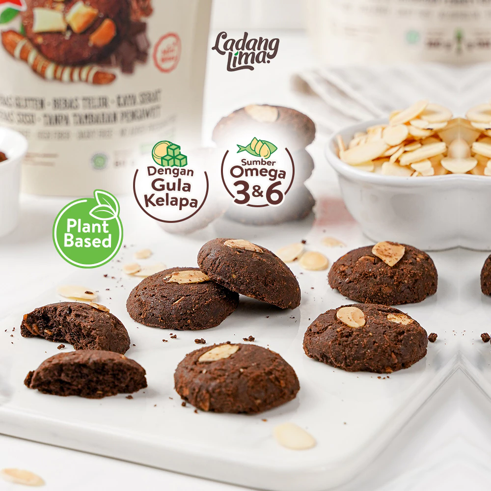 Kenikmatan dark chocolate dipadukan dengan almond panggang & tepung singkong Ladang Lima bebas gluten. Diolah dengan gula kelapa alami, tanpa telur & tanpa susu, menjadikannya pilihan tepat bagi gaya hidup sehat.